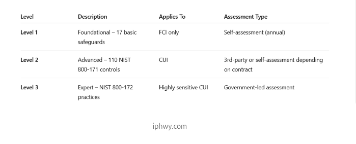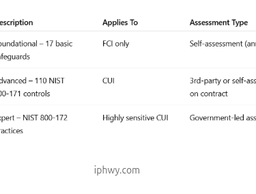 Phase 1 allows self-assessments for Level 1 and most Level 2 organizations, with results logged into the Supplier Performance Risk System (SPRS). Later phases (rolling out through 2028) will escalate requirements, meaning third-party and government audits will become the norm.